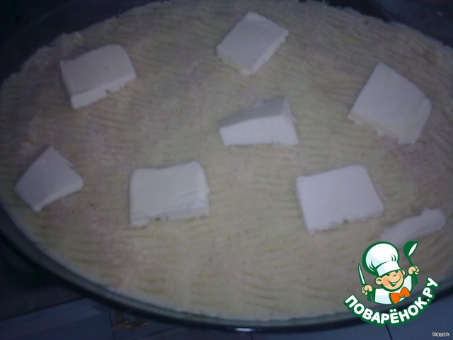Сливочное масло режем на кусочки и равномерно распределяем их поверх пюре.