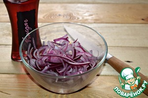Лук нарезать полукольцами, залить уксусом и оставить мариноваться на 10-15 минут.
