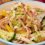 С лука слить уксус, промыть его под проточной водой, чтобы убрать запах уксуса, добавить к овощам.