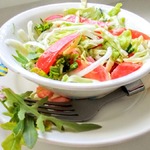 Полить салат заправкой, посолить, поперчить, перемешать.