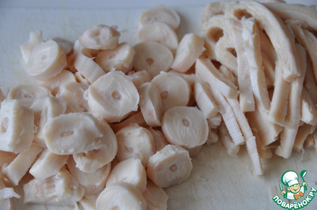 Щупальца режем колечками толщиной около 3 мм, а капюшон полосками (они похожи на полоски кальмара).