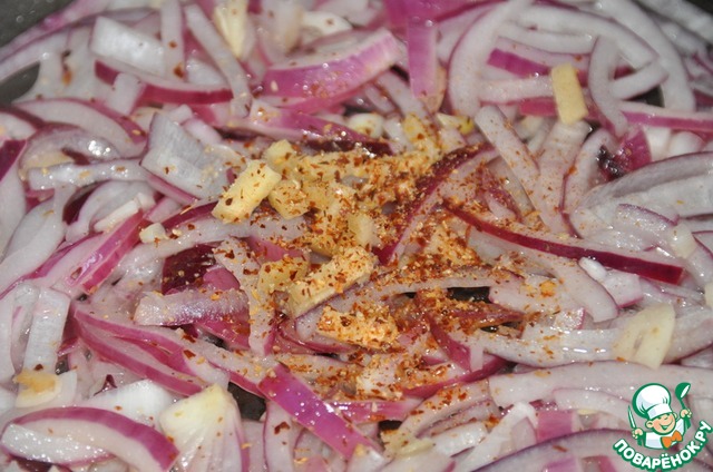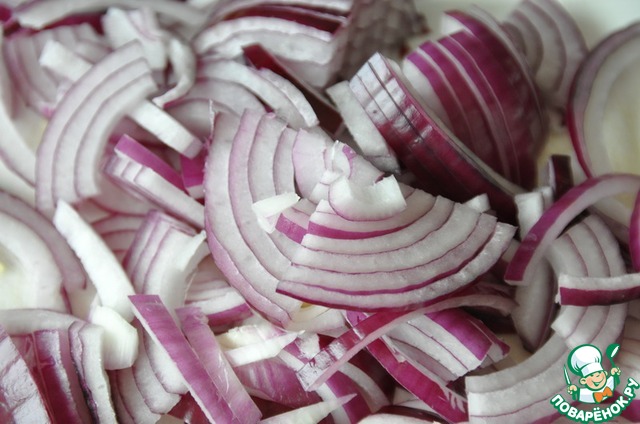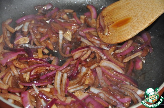 Красный лук чистим и режем тонкими полосками, кладём на сковороду и обжариваем до мягкости пару минут.