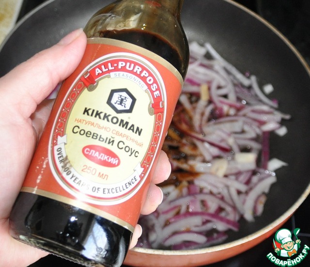 Наливаем сладкий соевый соус Kikkoman. Перемешиваем.