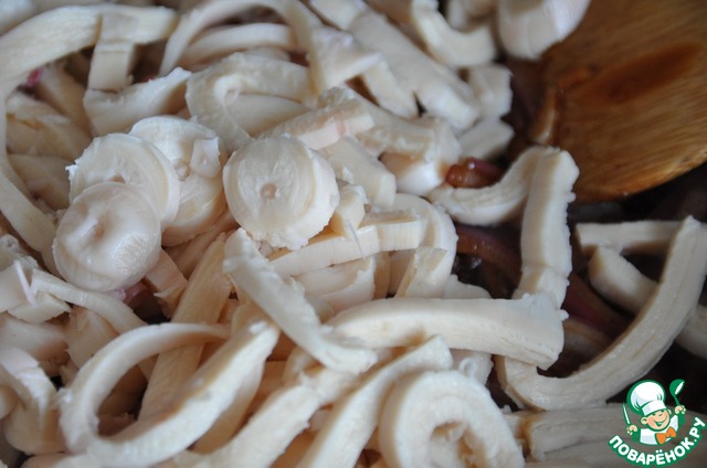 Добавляем нарезанного варёного осьминога. Если вы готовите иные морепродукты, то кладём их на этом этапе сырыми (нарезанными по необходимости).
