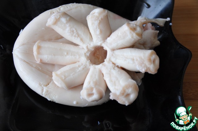 Я для приготовления использовала любимого мужем осьминога. Этот был изначально 11 кг. В этот раз мне попался "капюшон" и отростки обрезанных щупалец. Муж предпочитает именно "капюшон" из-за его мягкости.