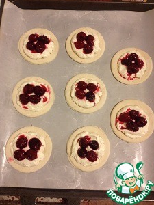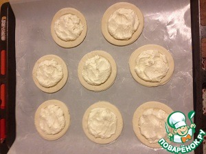 • Творог взбить со сливками, 3 столовыми ложками сахара и ванильным сахаром (можно взять ванилин 1 щепотка вместо ванильного сахара) до пастообразного состояния. Выложить творог на кружочки, не выходя за края углубления.