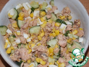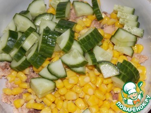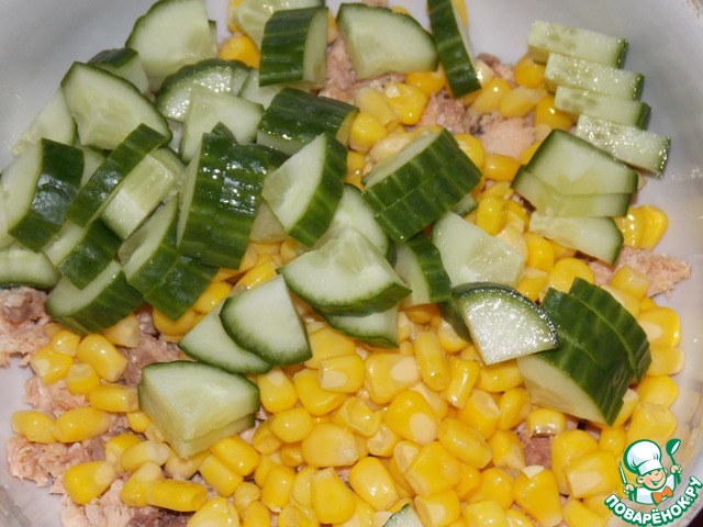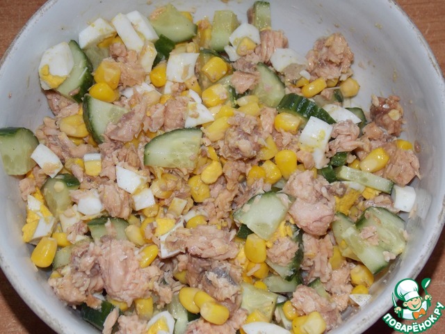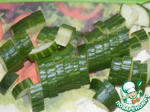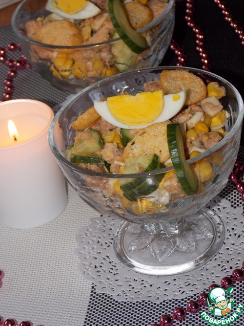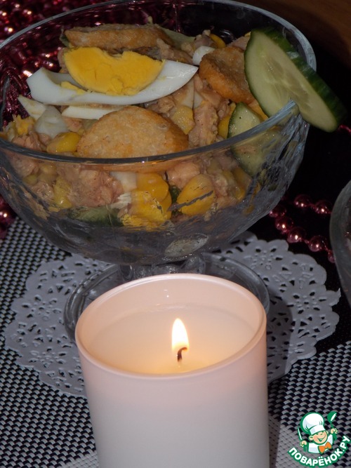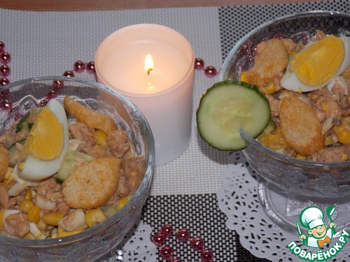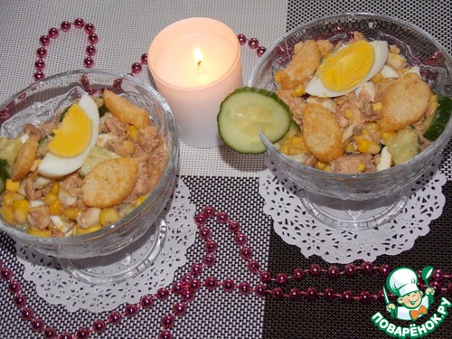 Разложить салатик порционно. Украсить сухариками, яйцом и огурчиком.