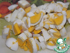 Нарезать яйца (одно оставить для украшения), выложить в тарелку.
