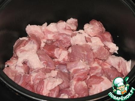 В мультиварку сложить свинину, специи, соль и травы, добавить воду.