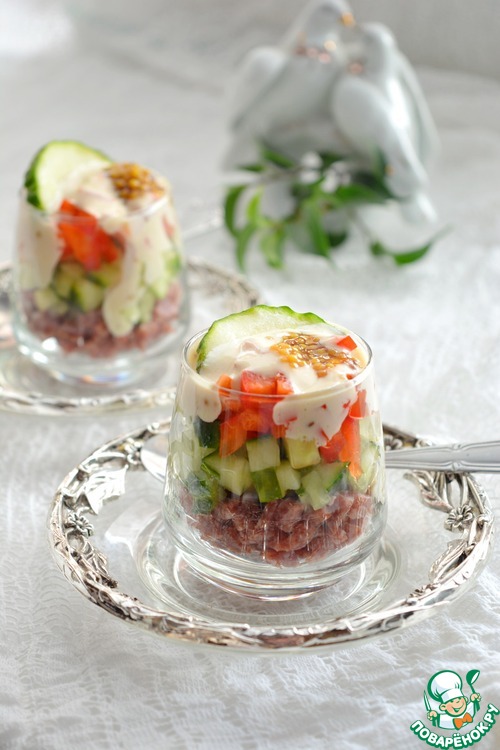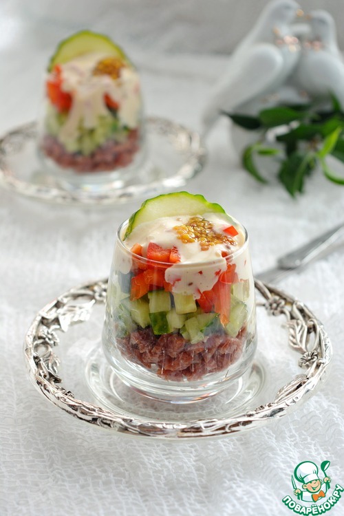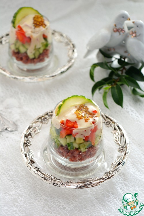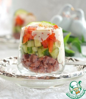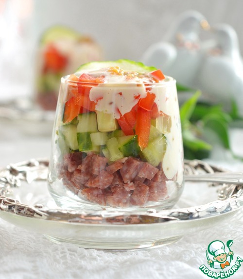 В бокал или креманку уложите колбасу, огурец и перец, полейте соусом сверху.