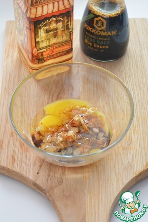 Обжаренный лук вместе с маслом, в котором он жарился, выложите в мисочку, добавьте сырой яичный желток, соевый соус, сахар и начните взбивать погружным блендером, постепенно вливая оставшееся растительное масло (я вливала в три этапа равными частями)