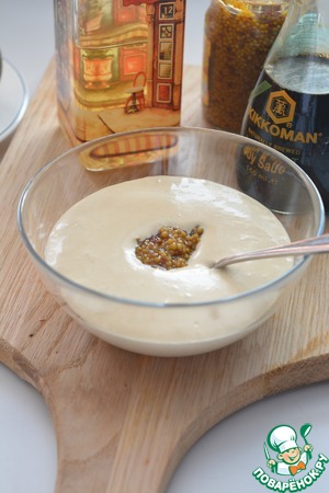 Получится вот такой соус. Приправьте его лимонным соком и горчицей. Соусу нужно выстояться в холодильнике 2 часа, чтобы он загустел. Его можно приготовить заранее.