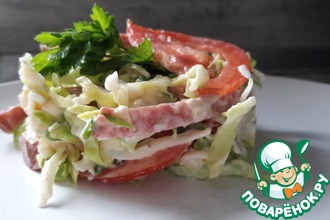 На самом деле, порой возникает дилемма - что приготовить на романтический ужин? Женщинам хочется чего-то лёгкого и изысканного, а мужчинам в душе всегда хочется мяса или колбасы. Этот салат соединит в себе лёгкость овощей и вкус колбасы. А "подружит" эти вкусы необычный луковый соус.