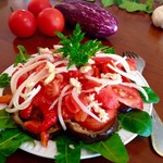 Затем баклажаны, отжатый лук и полоски перца, помидор, нарезанный сегментами, приправить перцем и, если нужно, солью, полить заправкой.