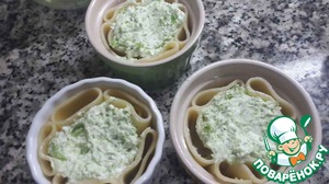 Выложить на соус получившеюся запеканку, в серединку тоже положить немножко песто.