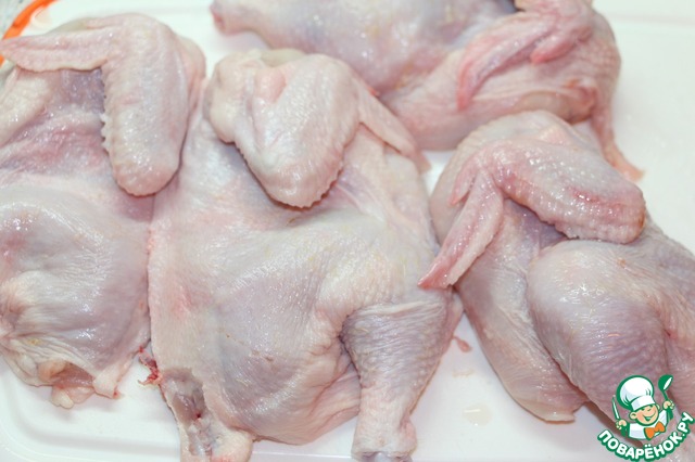 Если у Вас маленькие цыплята, их достаточно разрезать пополам, если большая курица, разрезать на порционные куски.