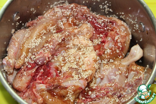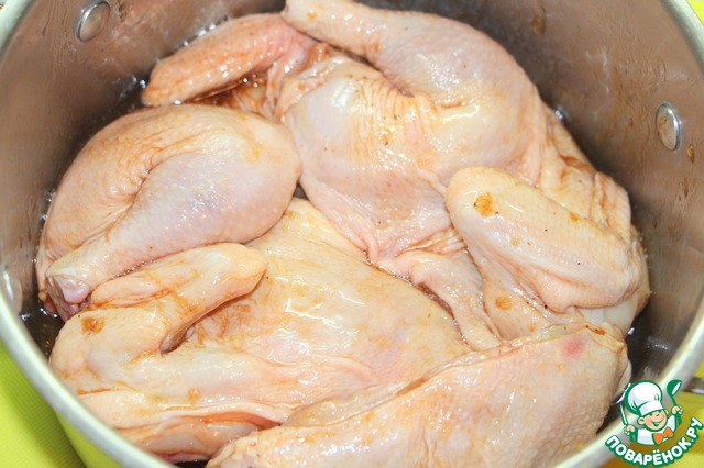 Поставить в холодильник не менее, чем на 6 часов. Пару раз куски курицы перевернуть.