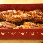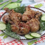За час до жарки цыплят из холодильника достать, чтобы они нагрелись до комнатной температуры. Маринад немного промокнуть. Выложить куски курицы на противень, застеленный бумагой для выпечки. Запекать в заранее разогретой до 200 градусов духовке 40-50 минут.