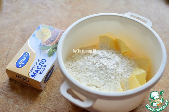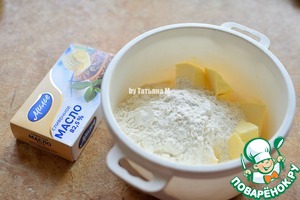 Охлажденное масло порезать кусочками, добавить соль, муку и размять масло в крошку;