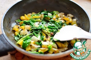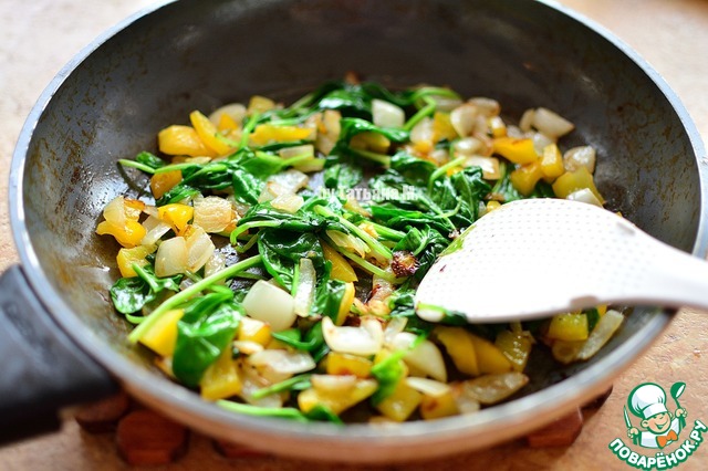 Лук и перец порезать произвольно, выложить на сковороду, добавить немного масла и поджарить до легкой корочки, добавить шпинат, перемешать, подсолить и убрать с огня;