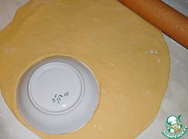 Тесто раскатываем ок. 0,3 см., вырезаем тарелочкой круги - это будет основа.
