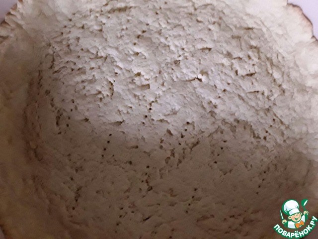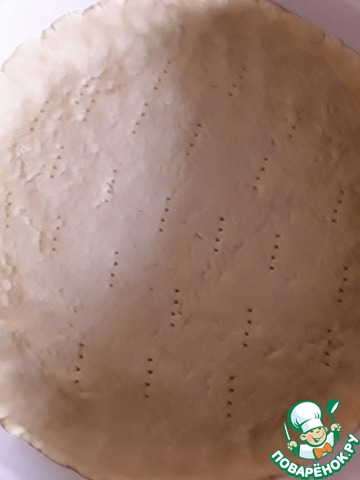 Выкладываем тесто в форму диаметром 26 см., делаем бортики примерно 2 см и накалываем тесто вилкой. Накрываем тесто пищевой плёнкой и ставим в холодильник на 30 - 40 минут.