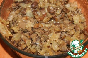 Грибы мелко нарезать и обжарить с мелко нарезанным луком почти до готовности.
