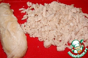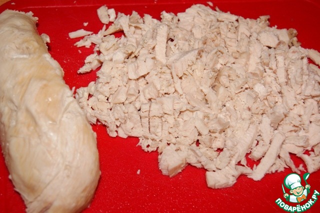 Куриное филе отварить с вашими любимыми специями. Остывшее филе нарезать очень и очень мелкими кусочками.