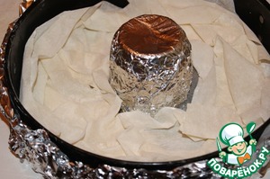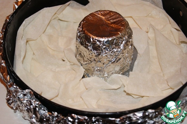 Дно формы диаметром 26 см с трубой (если такой нет, то можно в центре поставить небольшую баночку, обернутую фольгой) и бортики смазать маслом.
