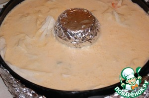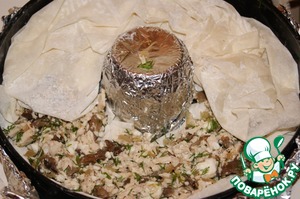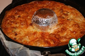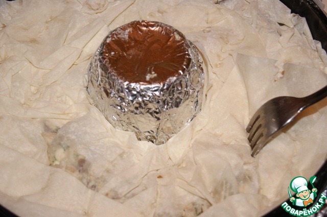 Накрываем начинку следующими 2 листами теста, опять его присобирая.