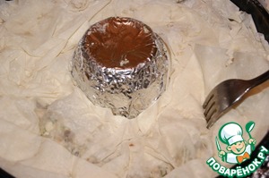 Выстелить тесто в форме, слегка его собрав вокруг отверстия, на это уходит 2 листа теста фило. -