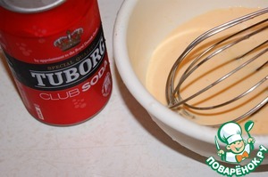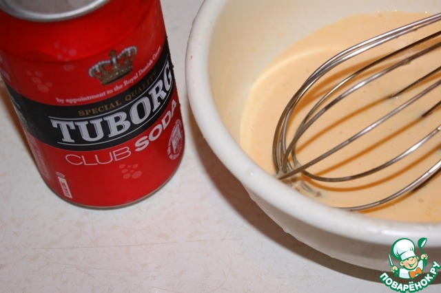 Яйцо, желток и сливки взбить венчиком. Добавить сильно газированную воду и перемешать.