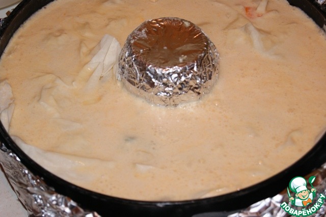 Покрыть заливкой весь пирог и выпекать его в прогретой до 180"С духовке 40-45 минут.