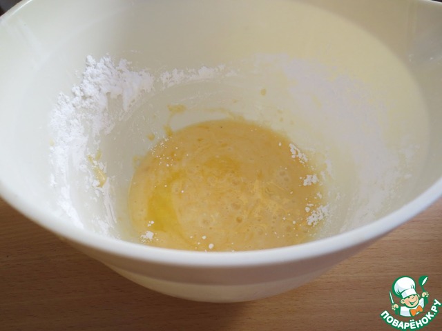 В отдельную миску просеять муку, добавить разрыхлитель, перемешать.