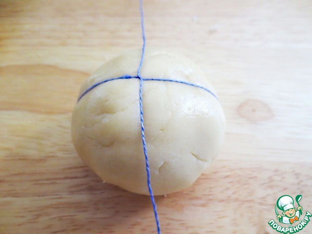 Залепить концы, опять сформировать колобок, перевязать ниткой, крест на крест