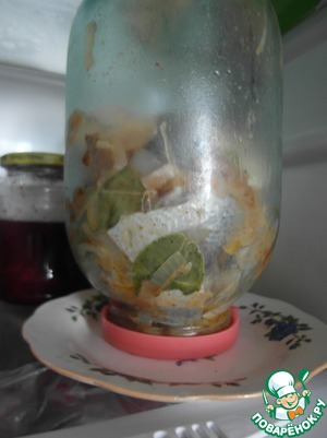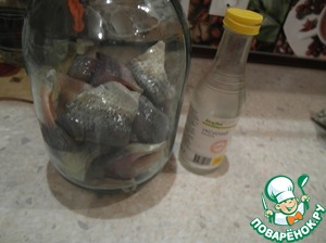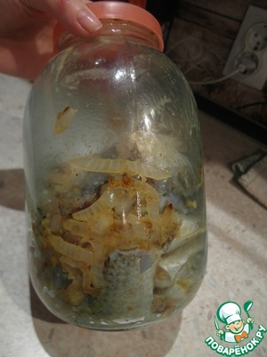 Достаем рыбу - перекладываем ее в банку, аккуратно добавляем уксус и закладываем горячие лук с маслом!
