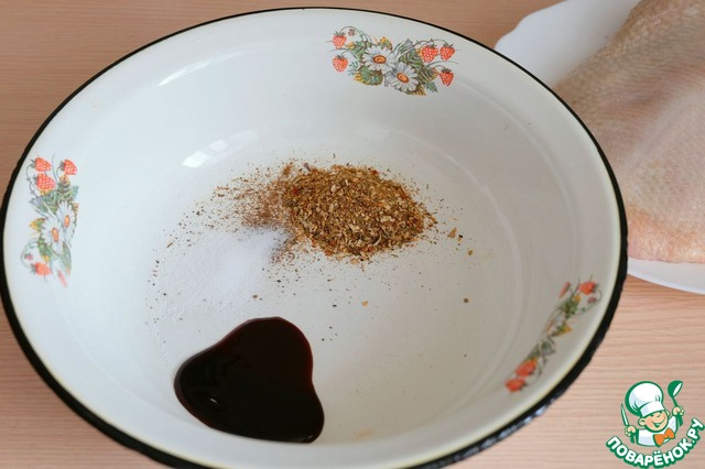 В миску добавить приправу для мяса (1 ст. ложку), соевый соус, соль, черный молотый перец. -