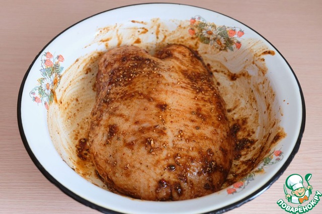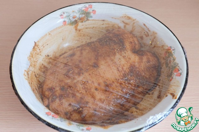 Емкость с грудкой покрыть пищевой пленкой и убрать в холодильник на 6-7 час., можно на ночь.