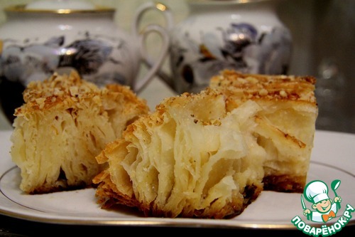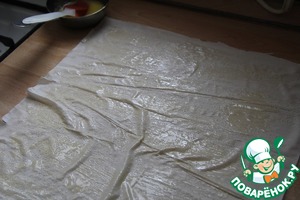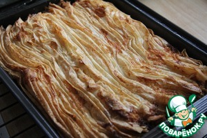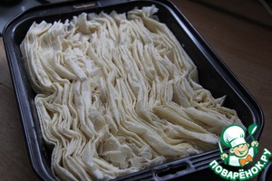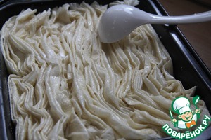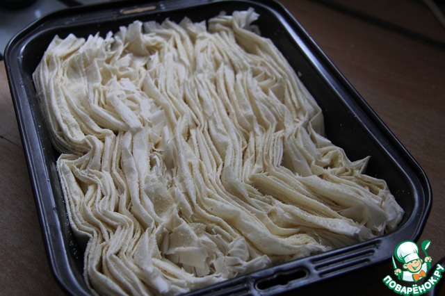 Все листы собрать подобным образом и поставить в слегка смазанную маслом форму друг к другу. Пока готовятся все листы, форму накрывать полотенцем, чтобы тесто не подсыхало.