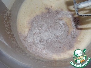 Муку смешать с какао и разрыхлителем, добавить в тесто, перемешать.