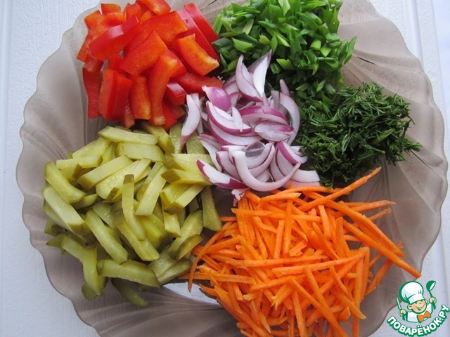 Нарежем соломкой половинку сладкого перца, три средних маринованных огурца и половину красной луковицы. Морковь натрём на тёрке для корейских салатов. Нам понадобится две столовые ложки тёртой моркови, измельчим зелень укропа и перья зелёного лука.
