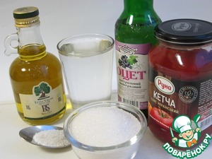 А теперь, займёмся непосредственно приготовлением маринада. Соединим в одной ёмкости: 250 мл холодной кипяченой воды, 500 мл вкусного томатного соуса с кусочками овощей, 180 мл растительного масла, 160 г сахара, 100 мл 6% винного уксуса и 1 с горкой чайную ложку соли.