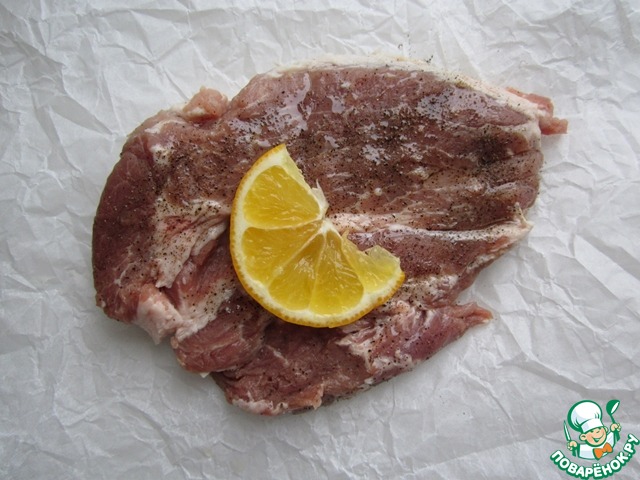 Антрекот весом 350 г приправим перцем, сбрызнем 1 ч. ложкой сока лимона и смажем 1 ст. ложкой растительного масла с двух сторон.