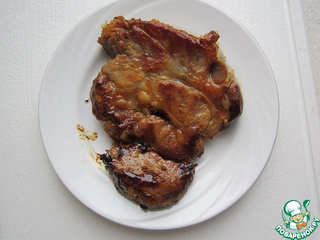 Снимаем мясо со сковороды и выкладываем на тарелку, солим по вкусу и отставляем в сторону прикрыв неплотно фольгой, минут на десять.