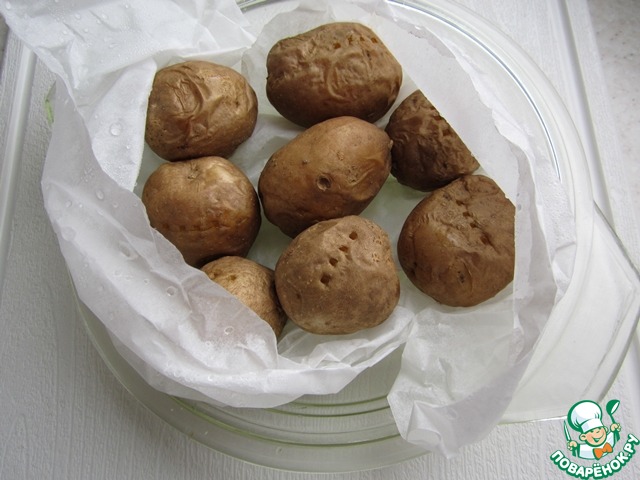 Готовить при полной мощности (в моём случае - 850 Вт) в течение 7-10 минут, в зависимости от величины клубней.
