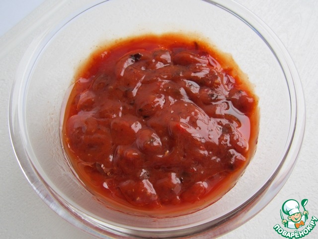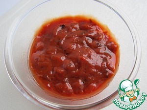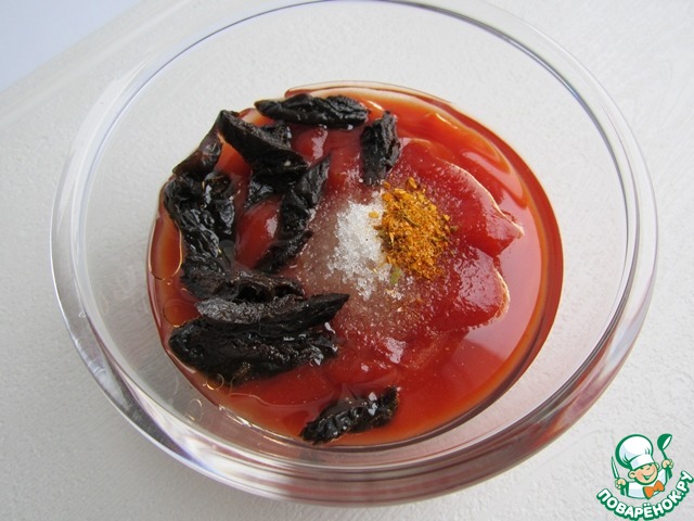 Приготовим соус. Для этого нам необходимо: 7 ст. ложек вкусного томатного соуса с кусочками овощей, 0,5 ч. ложки соли, 2 ст. ложки растительного масла, 0,5 ч. ложки специй для гриля и 3 штуки чернослива.