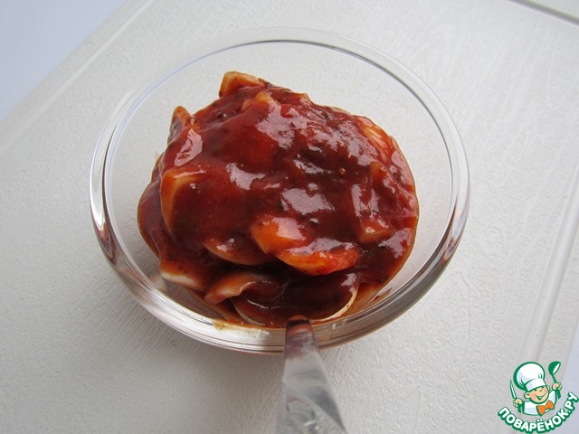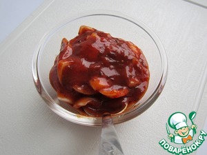 Затем добавляем к соусу маринованный лук вместе с маринадом.