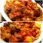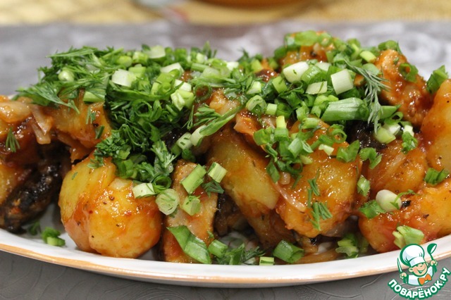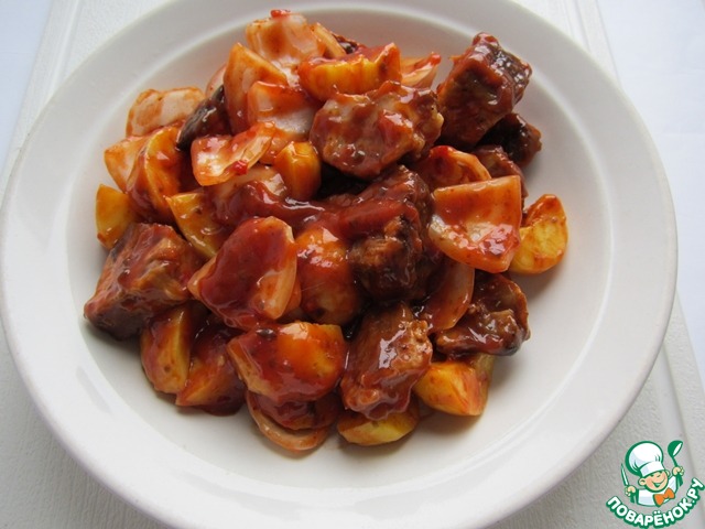 Соединяем картофель, мясо и соус с луком.