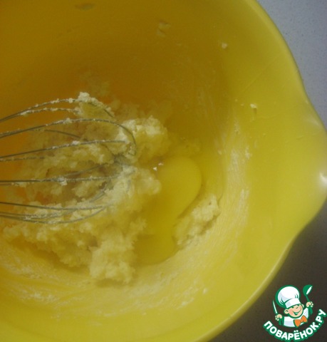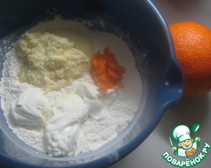 К мучной смеси добавить сахарно-яично-масляную, положить сметану и апельсиновую цедру.