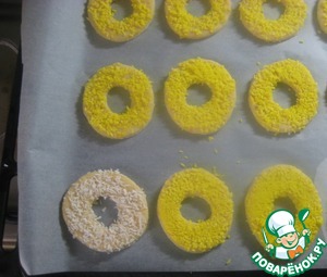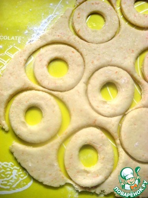 Охлажденное тесто раскатать в пласт толщиной 3-4 мм, вырезать колечки (у меня получилось 35 шт.)